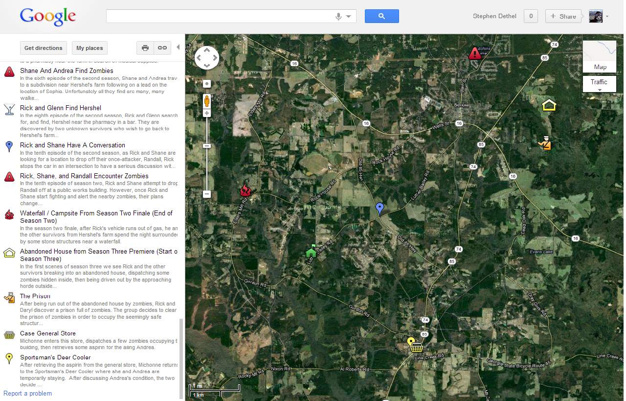 -How far, distance-wise, the prison is from Woodbury? Where are the Game of Thrones map-style opening credits when you need them?